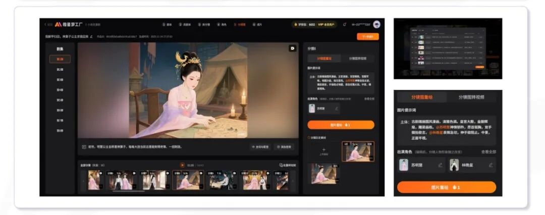 支持多剧集创作与管理,支持一键批量转视频、分镜重绘抽卡;分镜视频实时预览,快速反馈效果