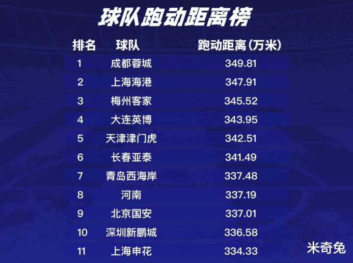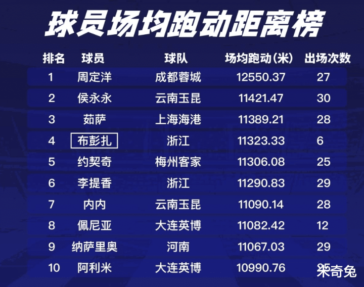 这个数据其实就是来自周定洋奠定的优势,他是上赛季中超场均跑动唯一一名超过12500米的球员,比第二名场均多跑超过1000米。